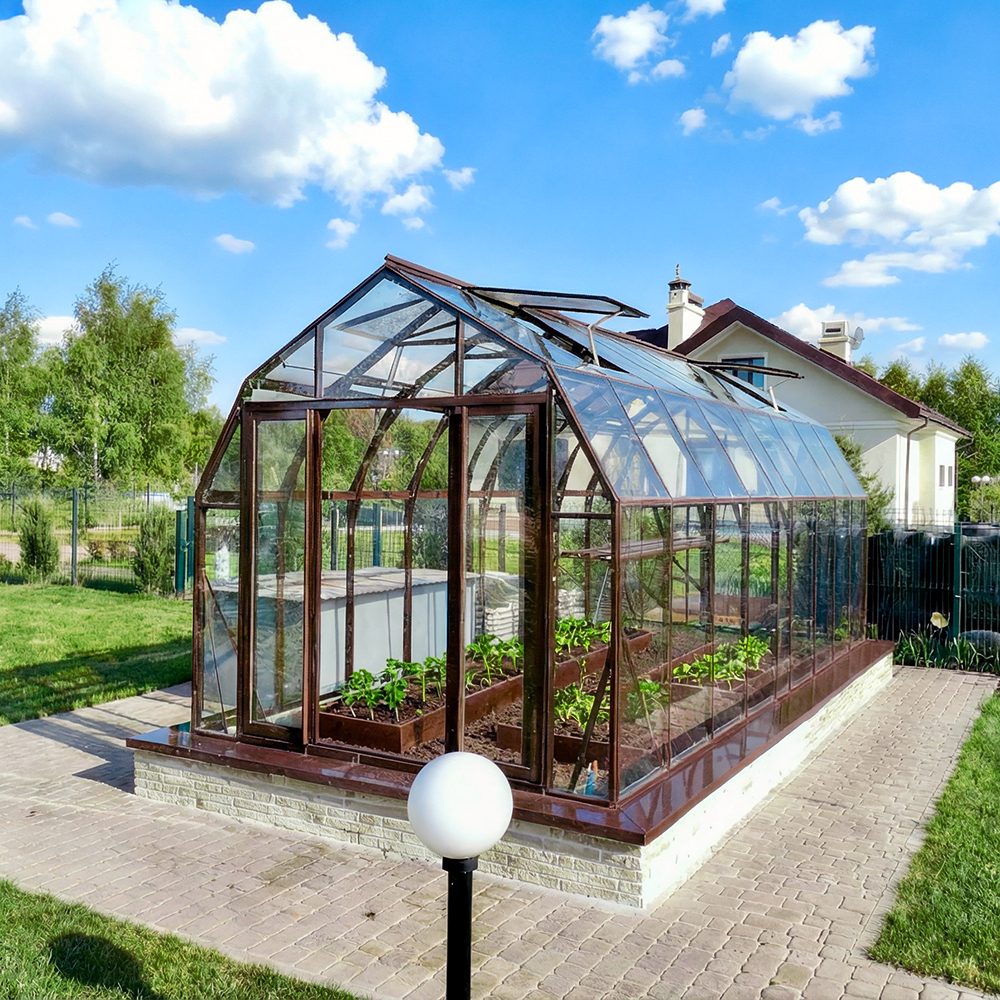 Красивая теплица CRISTALIKA Comfort с увеличенным объемом внутреннего пространства для размеров садовой теплицы. В качестве покрытия может использоваться закаленное стекло, которое, помимо собственной прочности, добавляет прочность и конструкции целиком, что в сочетании с достаточно жестким каркасом, делает эту теплицу пригодной для использования в любом регионе России без ограничений.