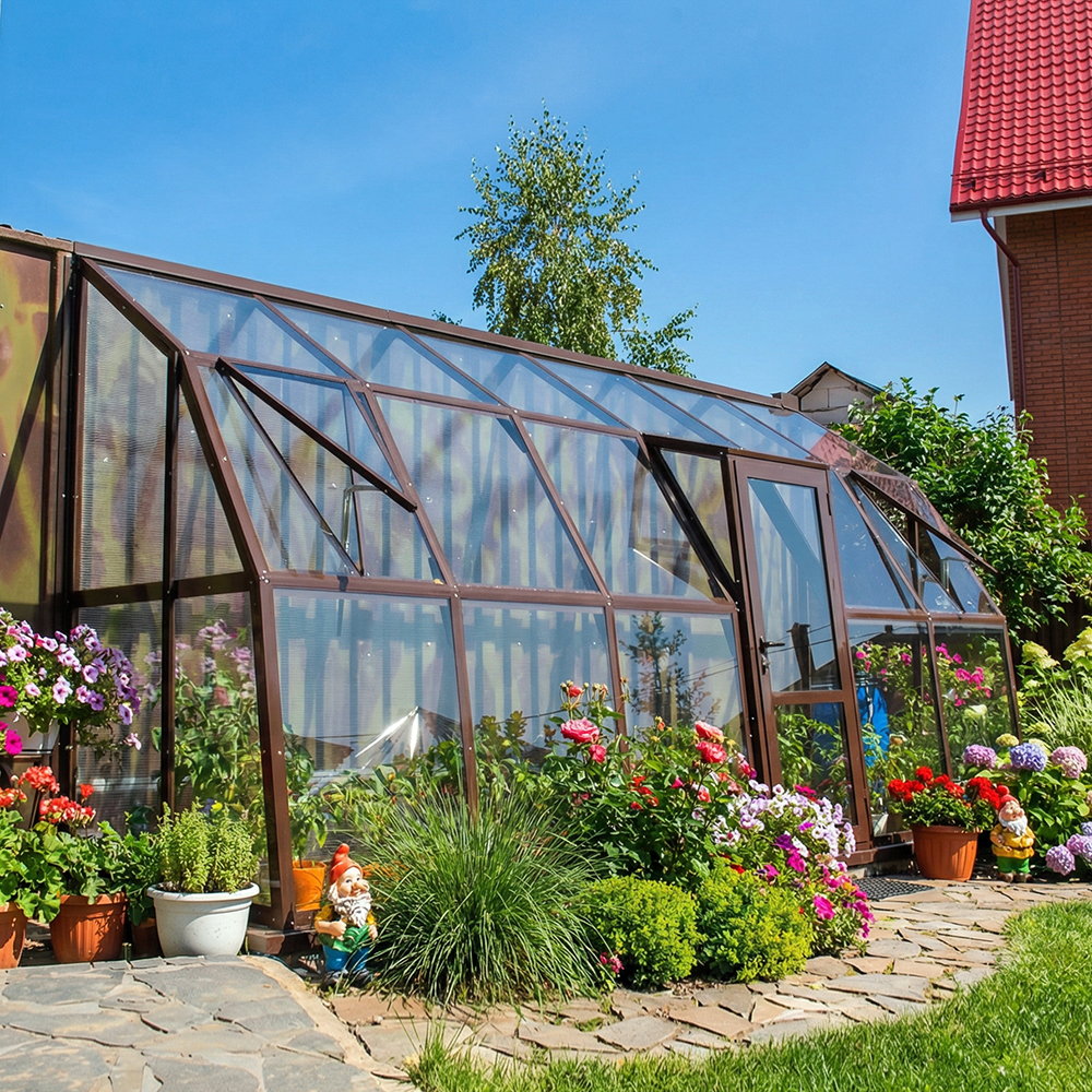 Модель обладает повышенной прочностью, так как «привязывается» к капитальному строению. Это позволяет выдерживать дополнительные снеговые и ветровые нагрузки. При изготовлении теплиц используется стекло марки М1 CLEAR FLOAT, толщина которого может достигать 8 мм. Возможна комплектация пристенной теплицы закаленным стеклом.